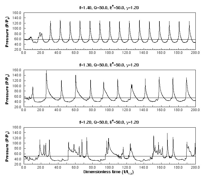In one space dimension ZND detonations are either stable or unstable to some perturbation. The result of the perturbations, if the detonation is unstable, is a pulsating mode instability. The following figures illustrates this behaviour for several unstable detonations. The degree of instablity is controlled by decreasing the speed of propagation of the wave. The lower the speed of propagation, for a given heat release and activation energy, the more unstable the detonation becomes.