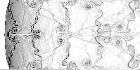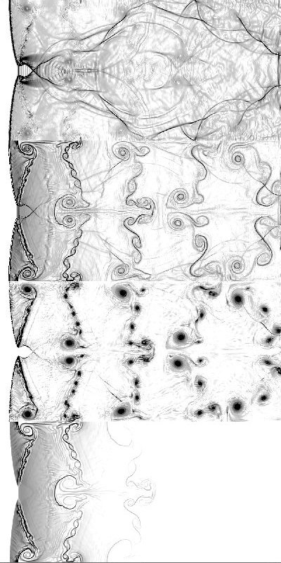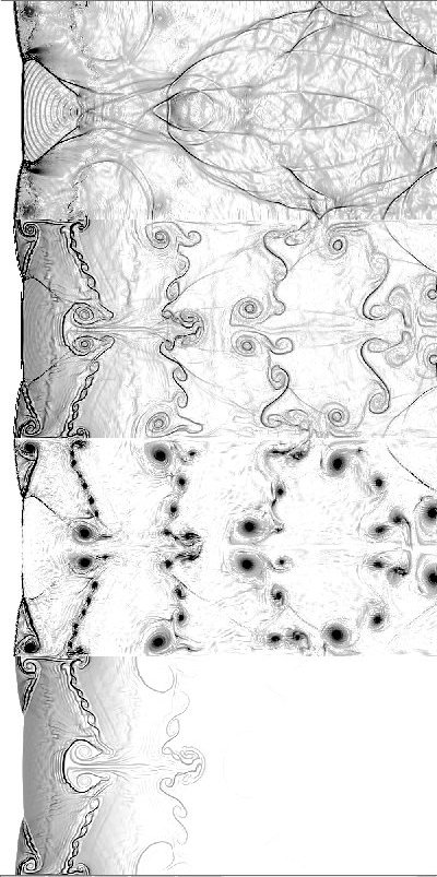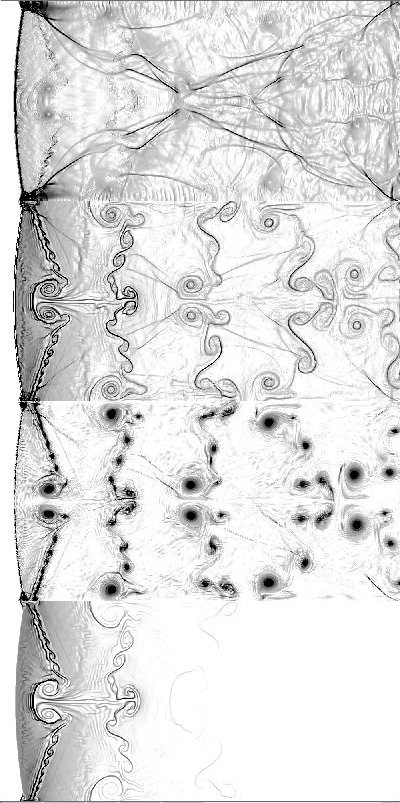 The following results were obtained using a direction split FCT code with single step chemistry and Arrhenius kinetics. The pictures are plots of (from top to bottom) pressure gradient, temperature gradient, vorticity, and gradient of fuel mass fraction. The pictures obtained for overdrive 1.2, activation temperature 10 and heat release parameter 50. They are smoother than other results because in these computations, grid jiggling was used on the 1000 by 500 grid.