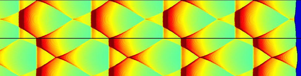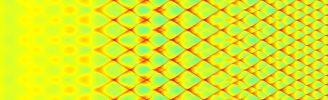 This case has fairly periodic cell structure The detonation starts out at the left hand side of the top picture, and propagates to the right. The second and third pictures are a direct continuation of the first. Out of the five complete cells in this series, the initial perturbation has the most effect on the first two. It finally merges with the main transverse waves about two thirds of the way through the second cell. By the third cell in the series, the detonation seems to be in its final state.
